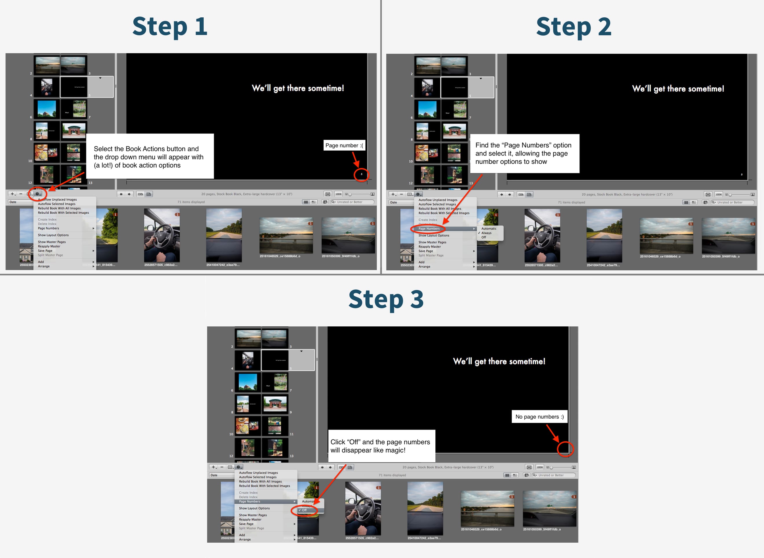 Apple's software generally pushes page numbers very close to the edge of the page. Sometimes it's ok, but due to the different trim size between us and Apple it can become a problem for your page numbers. Because of this we generally recommend removing them, as they can be right at the crop guide that makes them fully or partially disappear in production. Check out the steps below to remove them: