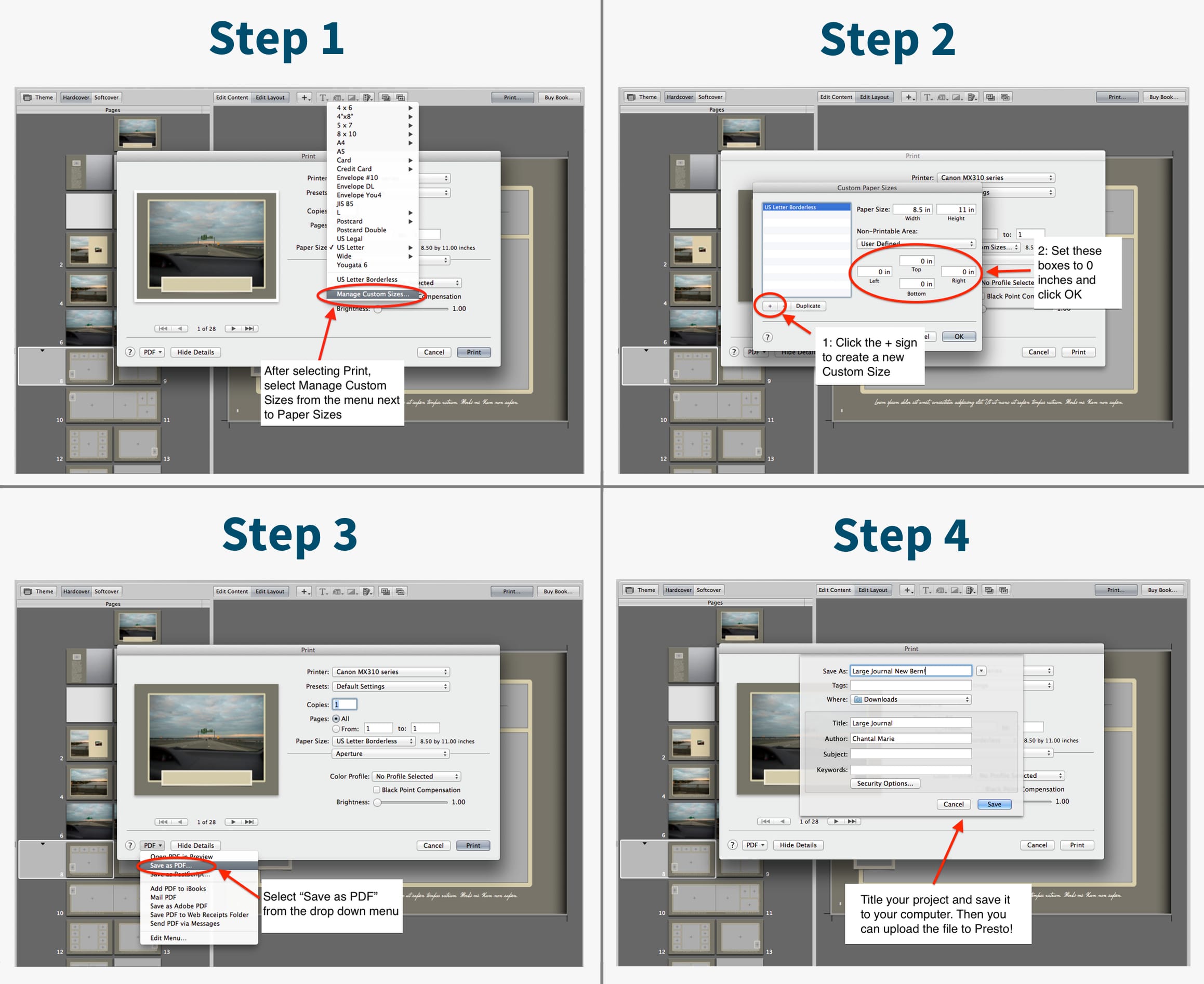 - Choose "Save as PDF" from the drop down menu at the bottom left using a Borderless Page Size